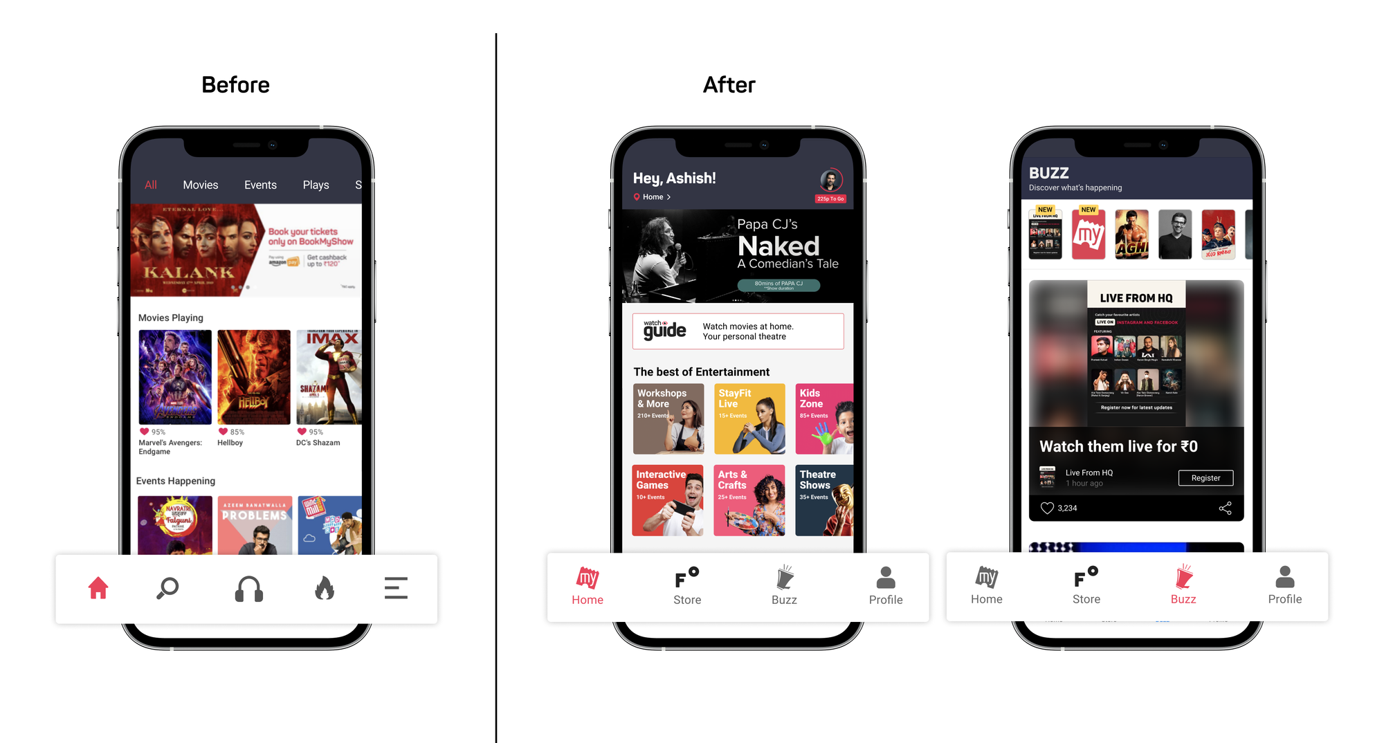The new navigation served 2 purposes. The home tab, with which users were already familiar with, doesn’t undergo radical shift but surfaces smart filters and better discovery of things. Buzz was the new tab added which worked purely on engagement metrics. At the same time, we also decided to launch an exclusive merchandise store. Everything seems to sit perfectly. Home is where the ticketing will continue. Store is when the user is in a mood to shop and Buzz is consuming content.