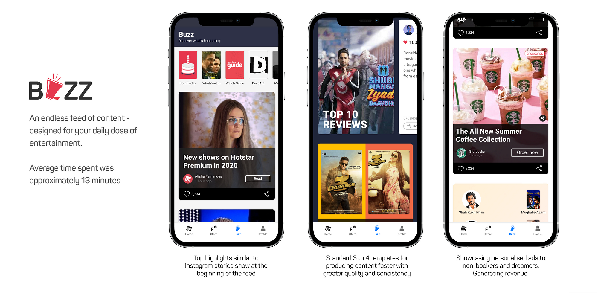Buzz — We always had content sprinkled across the app. With a dedicated tab to consume content, time spent on the Buzz tab grew from 10 seconds to about 13 minutes.