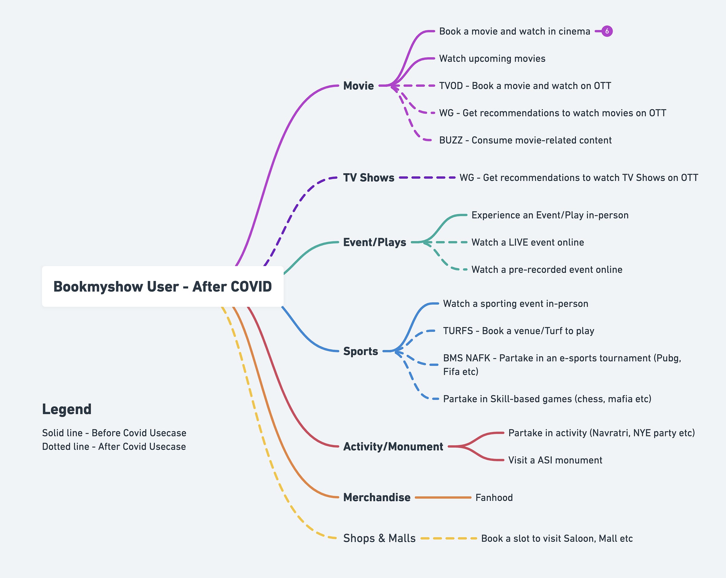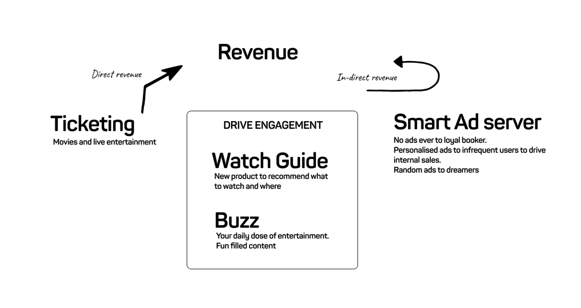 50M MAUs and 10M tickets. We called these 40M “nonbookers” and “dreamers”. Our strength was, a strong network of movie stars, standup comedians, sportsmen, and production houses across the country — We had the right levers to engage these dreamers to eventually convert or build potential revenue streams by serving contextual ads.