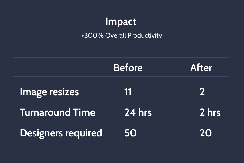 After making templates, I introduced automation tools like ImageKit for dynamically resizing images and serving them with faster performance. This was coupled with the use of a ticketing system for all creative requests through Jira, by Atlassian. It involved a big learning curve for the business operations and marketing team. It was handled effectively by regularly conducting workshops and training sessions. This also involved making a few changes on the product side to make size more consistent and modular components.